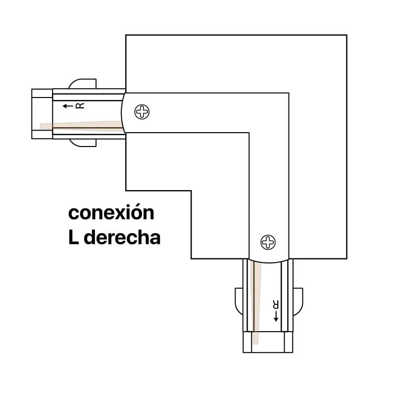 Conector L derecha, para conectar dos carriles trifásicos empotrables en un ángulo de 90º.